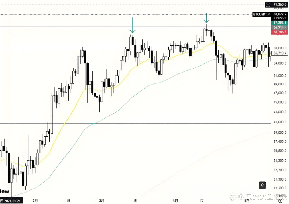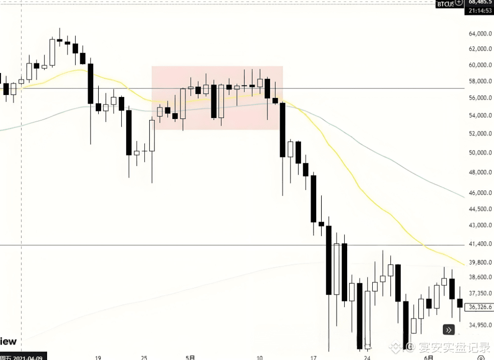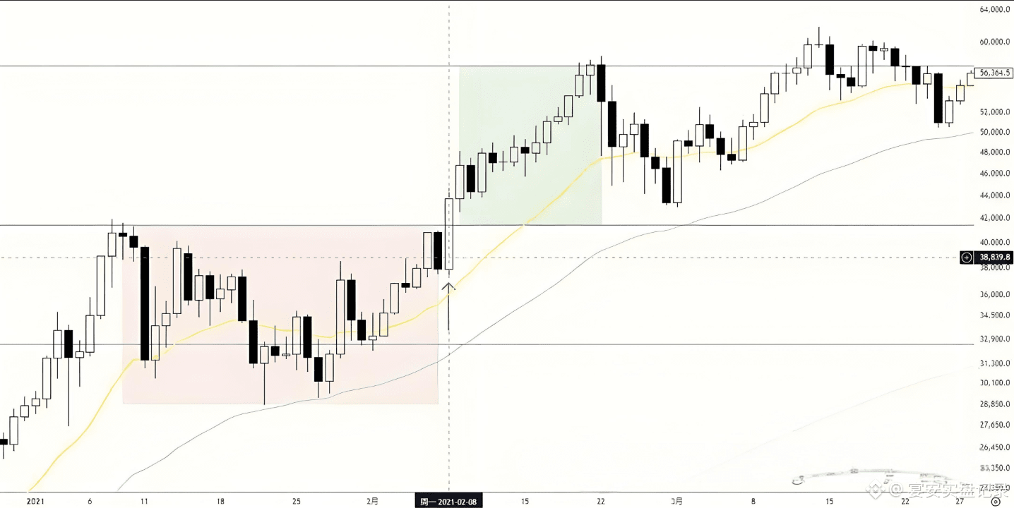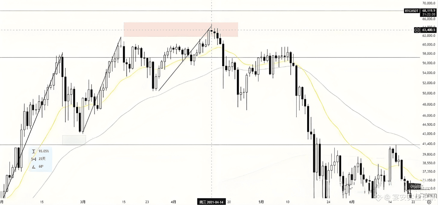 回到 K 线图上,我们可以看到初始一段上涨的走势($14000-$20000 之间)显得犹豫不决,因为出现了重叠的 K 线排列。每上涨一点,价格就会回撤一点,再上涨一点。这种现象反映了市场主力之间的不同看法。#美SEC代币化股票交易计划