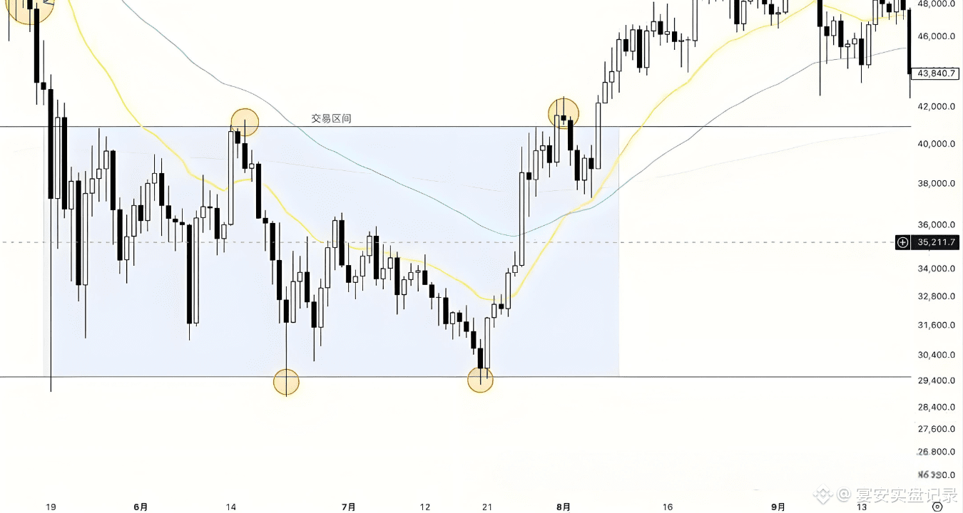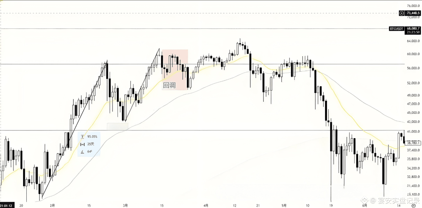 因为价格触及 4 万时,它是 2 万的翻倍,是一个心理关口上的阻力位。因此,做空的主力开始尝试做空,但他们不会大举进场。原因在于牛市的结构依然很健康。如我之前所说,主力参与者不会在第一个极点时就重仓进入,而是等到市场对这一极点的测试出现乏力时,才会逐步加仓做空。