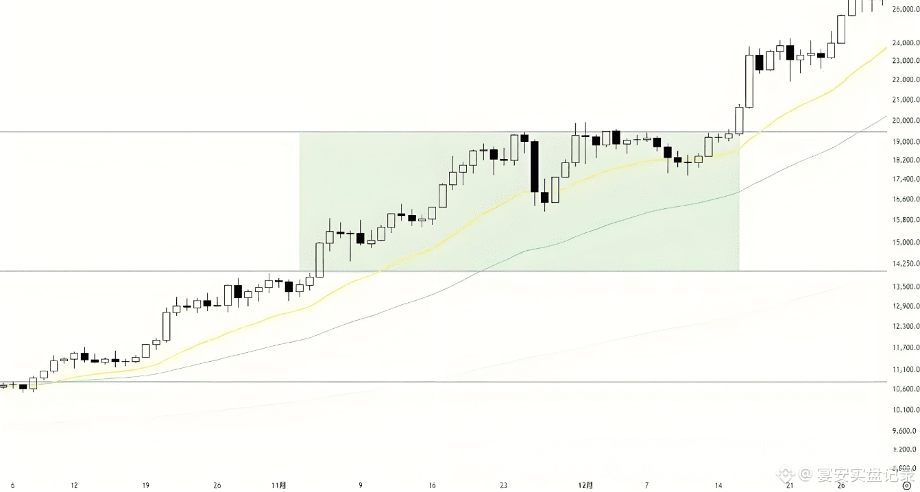因为在 2 万以上, 市场没有显著的阻力位 ,机构开始更加积极地进行买入操作。他们在任何小幅回调或突破时都进行买入。而那些有意做空的主力此时不会贸然入场,因为聪明的交易者知道在强劲的上涨趋势中 逆势操作风险较大 ,只有在价格到达有逻辑支撑的位置时才会考虑做空。