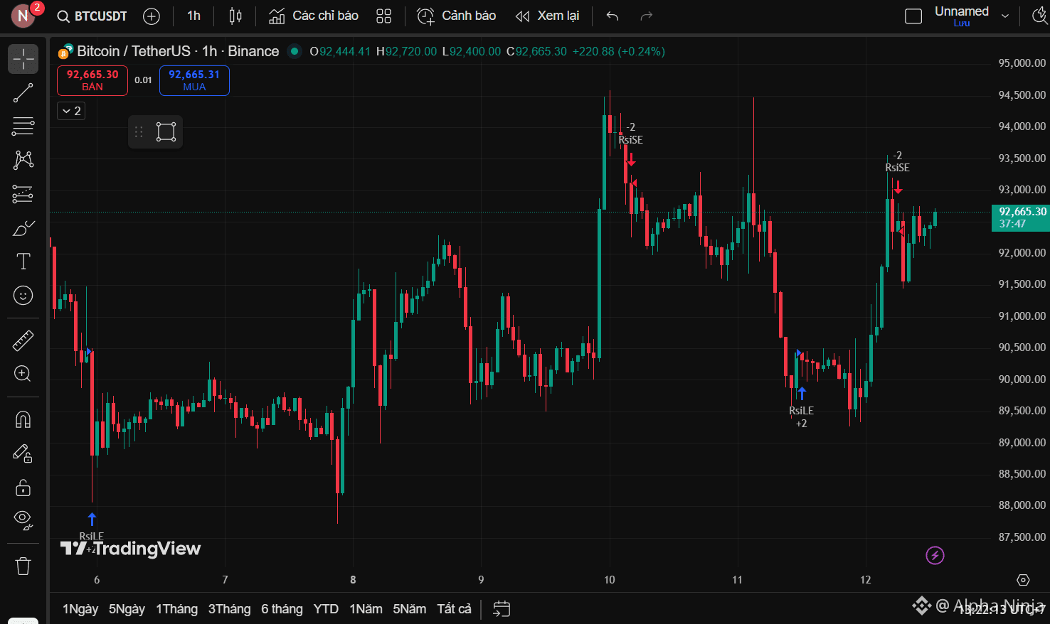 Sau cú tăng mạnh tạo đỉnh, BTC không bước vào giai đoạn tích lũy mà rơi vào điều chỉnh khá nhanh. RsiSE xuất hiện đúng đỉnh cho thấy lực mua đã đạt ngưỡng tối đa. Nhịp hồi hiện tại diễn ra trong bối cảnh RSI không thể quay lại vùng cao, chứng minh dòng tiền mới không tham gia. Cấu trúc giá thể hiện rõ lower high, các nhịp hồi đều bị bán xuống ngay khi chạm vùng cản.
