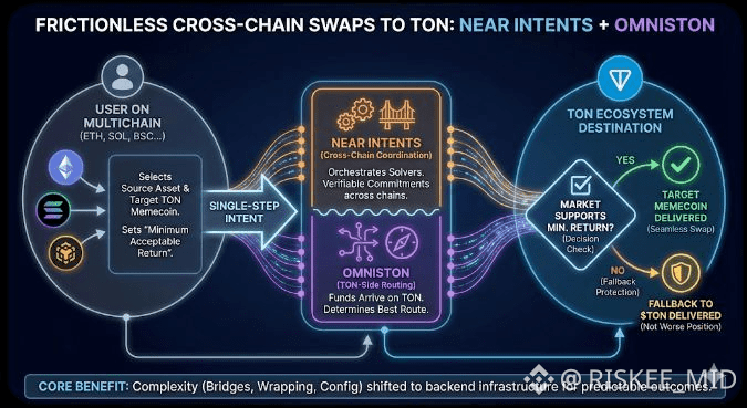 The NEAR Intents + Omniston integration is a small but telling step toward hiding multichain complexity behind robust infrastructure while preserving predictable outcomes. During MemeRepublic it showed up as a practical mechanism that let demand flow from many chains into TON memecoins with far less friction than the old manual approach. If architects keep focusing on verifiable commitments, clear fallback semantics, and modular evolution of layers, these hybrid flows could move from clever experiments to foundational primitives for multichain DeFi.