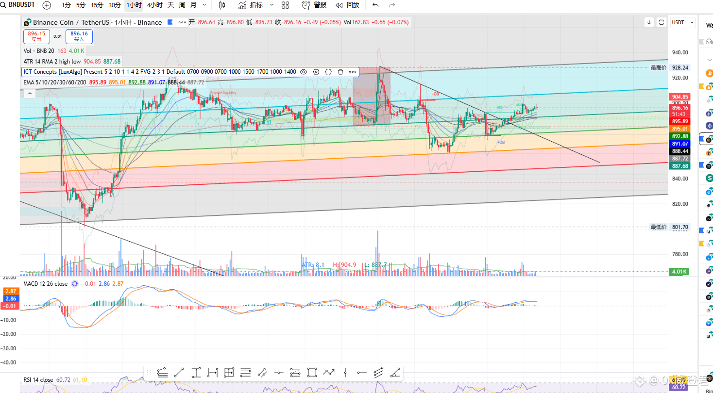 🔹$BNB (现价 896):与 ETH 走势接近,同样落在 0.786-0.618 区间,短期看多 —— 进场区间 881-888,止损 860、目标 915-925。