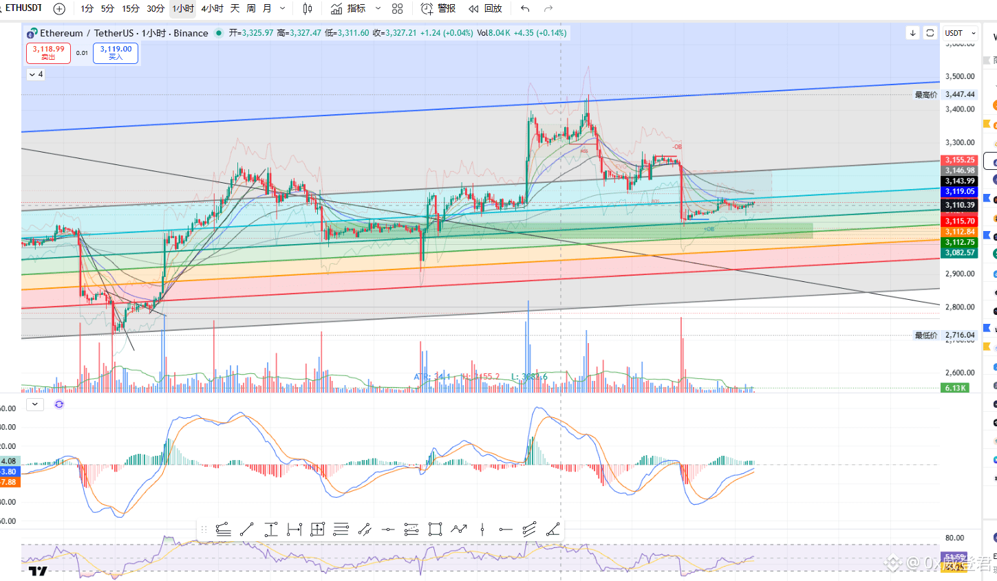 🔹$ETH (现价 3118):走势略强于 BTC,回调至 0.786-0.618 区间,短期偏多 —— 可在 3100 附近进场,止损 2990、止盈 3200-3250;