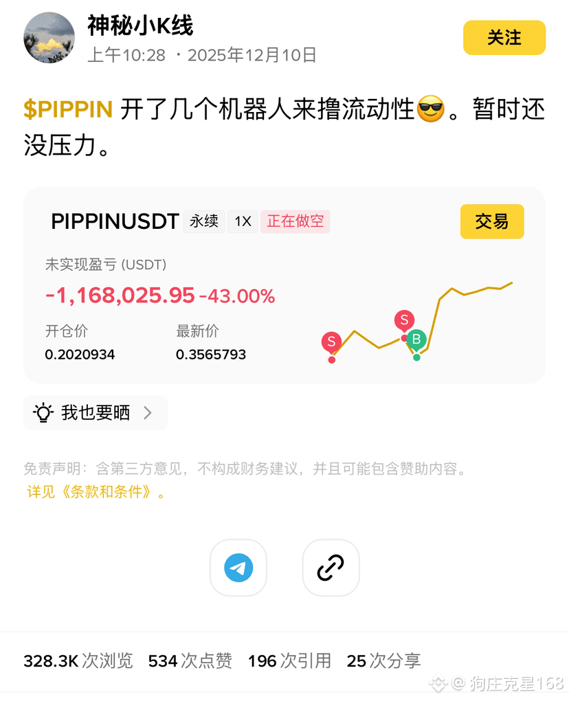 这个币大家不陌生了,已经拉了很多倍了,目前市值3.56亿美金左右,说大不大,说小也不算小的盘子。有一个比较有名的叫小K线的博主开了空单,目前浮亏117万usdt约合人民币八百余万,妥妥的大户。这里可以插一句,我简单看了一下小k线的单,可以说盘感和技术基本是没有的,纯粹靠有钱任性,无限保证金抗单等盈利,这种大家关注看一乐就可以,你没有那么多保证金,跟他的单只会死得更快。