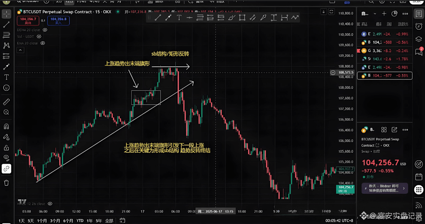 那么第二个意义呢,就是可以通过末端旗形做反转单。这种玩法就适合那种胆儿大的人!就是他会认为只要出现了末端旗形、或者潜在的末端旗形,那后续的行情一定是反转,而不是震荡调整后生成更大级别的趋势延续。