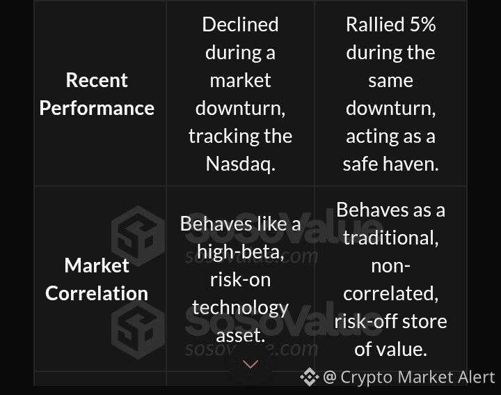 **Market Correlation** | Behaves like a high-beta, risk-on technology asset. | Behaves as a traditional, non-correlated, risk-off store of value. |