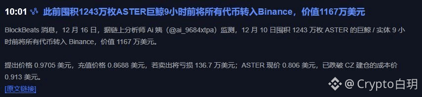 一个囤了1243万枚ASTER的巨鲸大佬,在9小时前,把所有的货,一口气全转进了币安,价值1167万美元!