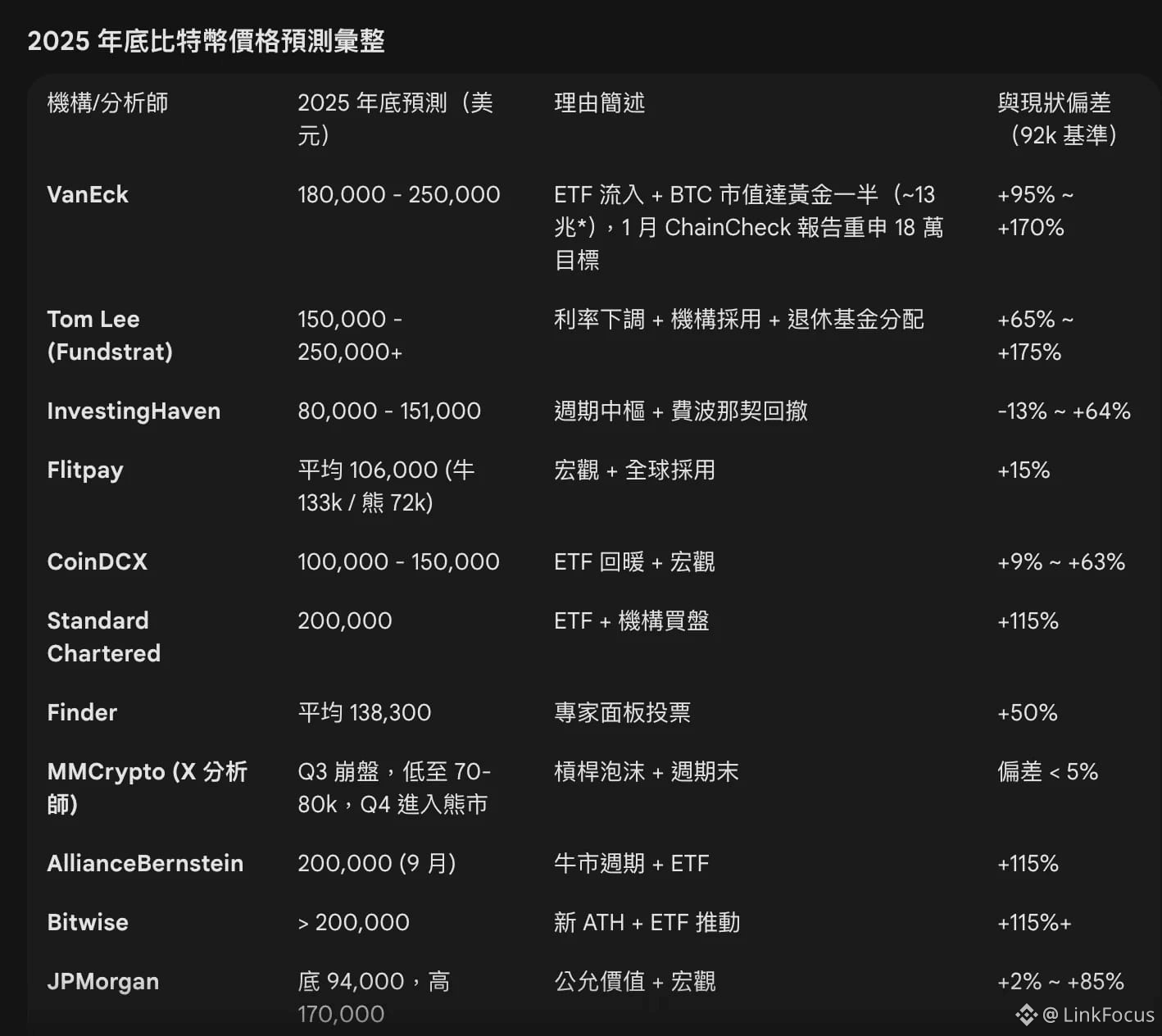 要理解当前市场的紧张情绪,还需回顾2025年以来市场的整体表现。年初,在比特币减半、现货ETF获批以及美国潜在友善政策这“三大支柱”的支撑下,华尔街机构普遍给出了15万美元以上的年终目标价。然而,现实是比特币在10月见顶后一路走低。