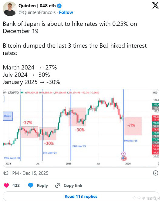 历史经验表明,日本央行收紧货币政策往往对全球风险资产产生负面影响。当日本提高利率时,日元套利交易会被迫平仓,全球融资条件收紧,杠杆头寸被迫去杠杆化。加密货币评论员Quinten的数据显示,比特币对日本央行近三次加息反应明显负面,2024年3月下跌约27%,2024年7月下跌30%,2025年1月再度下跌30%。