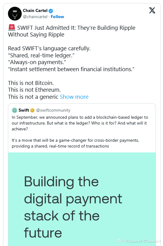 $XRP في تعليق حديث، سلط عشاق العملات الرقمية Chain Cartel الضوء على تحول في كيفية وصف SWIFT الآن لمستقبل بنية الدفع الخاصة بها.