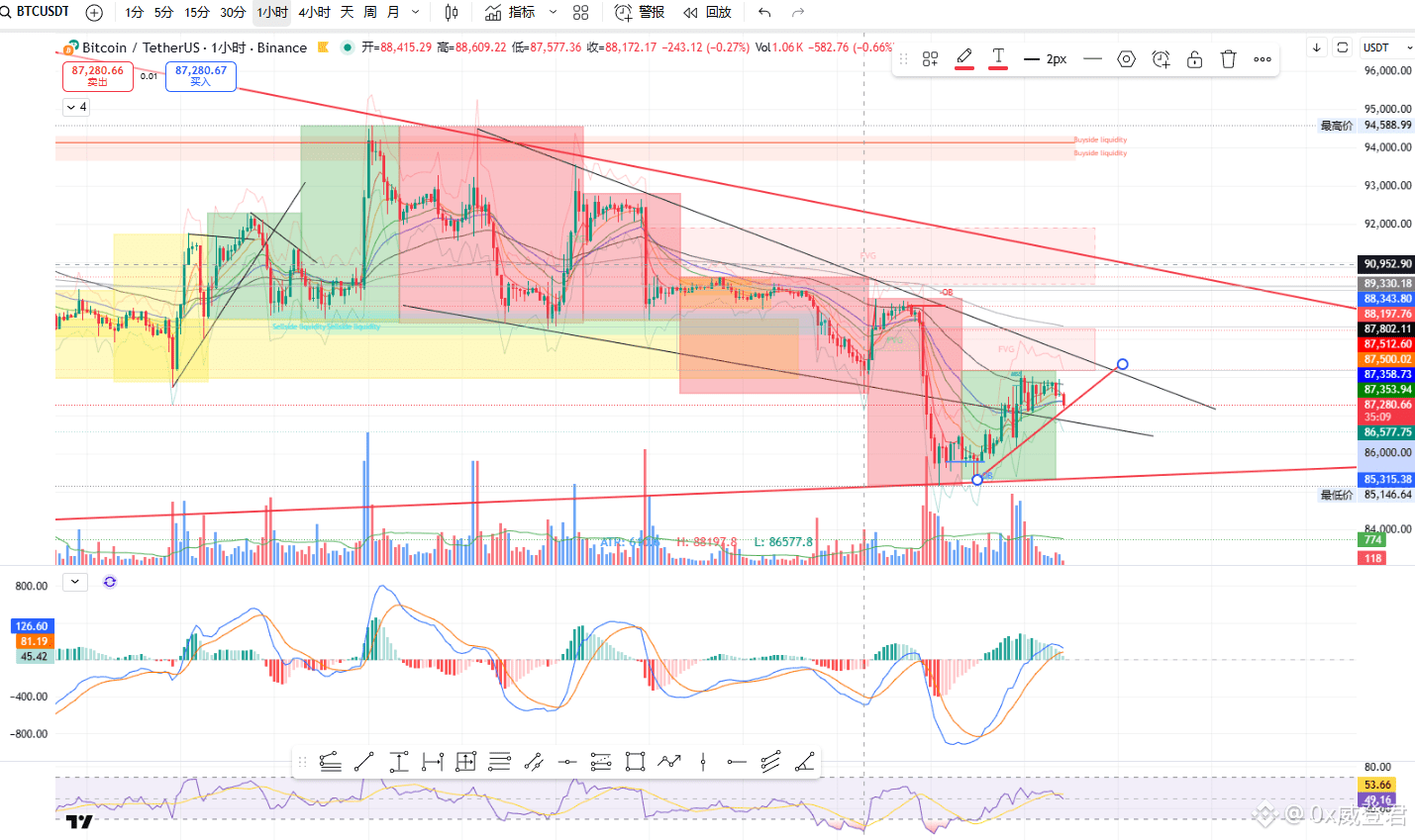 🔹BTC(现价 87280):偏空走势很直白,88000 的压制像 “硬天花板” 顶得死死的,短期回调概率拉满;支撑先盯 86000-85000 区间,后续想反弹,得先啃下 88000-90000 这道压力坎。