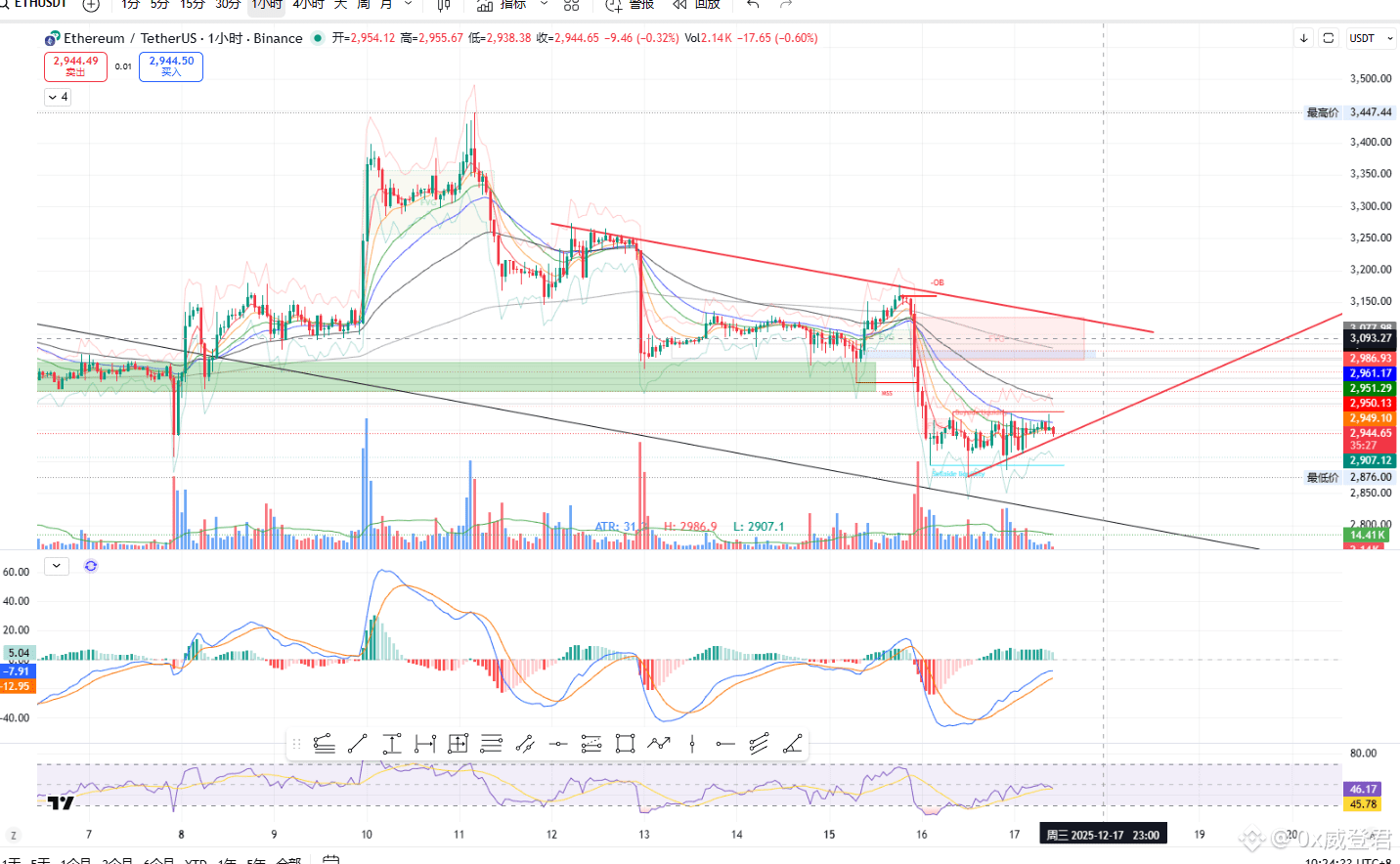 🔹ETH(现价 2944):卡在前期缺口位置 “多空拔河”,目前多头稍占上风;支撑锚定 2900-2850,能站稳的话,往上可冲 3025-3060 的压力区。