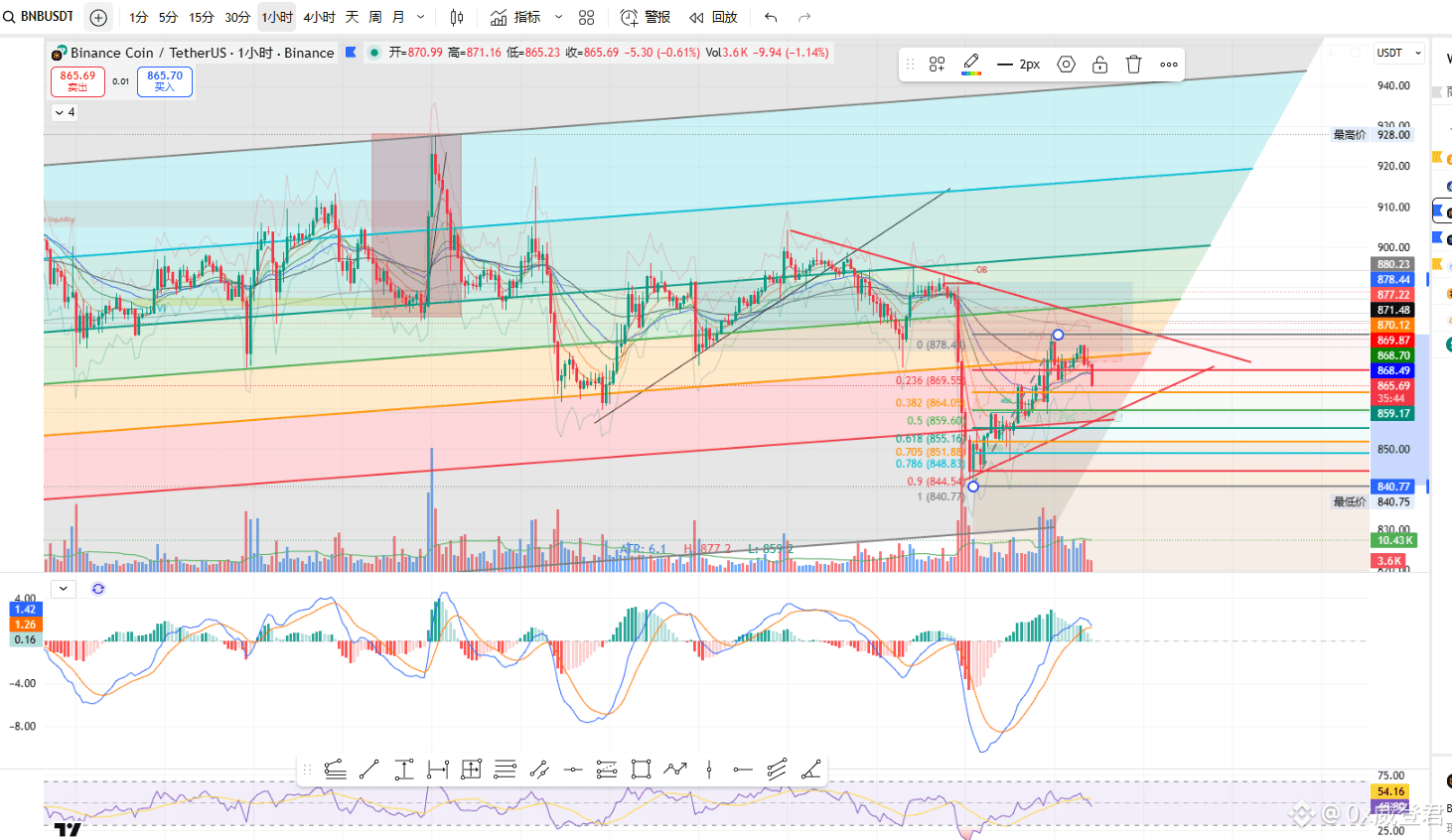 🔹BNB(现价 865):走成对称三角形形态,多空现在 “谁也没占着便宜”;回调先看 859-847 支撑,想打破僵局,得先站上 880-890 的压力带。