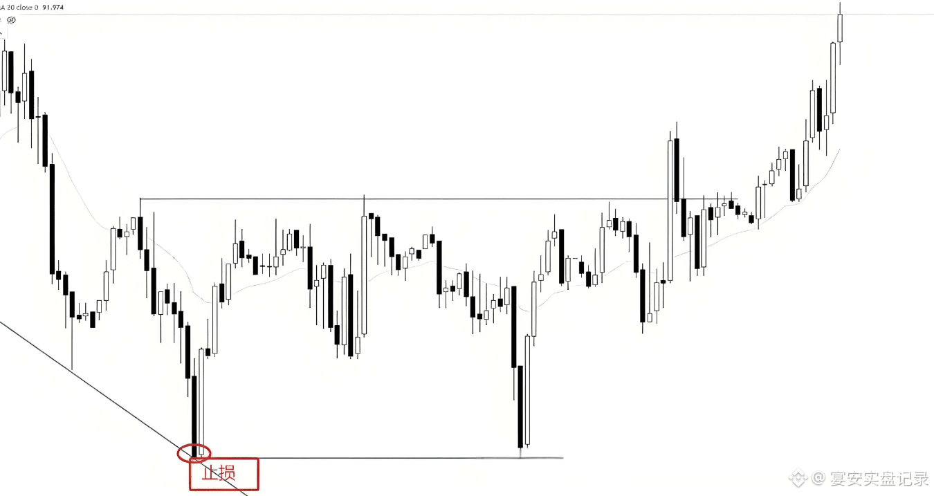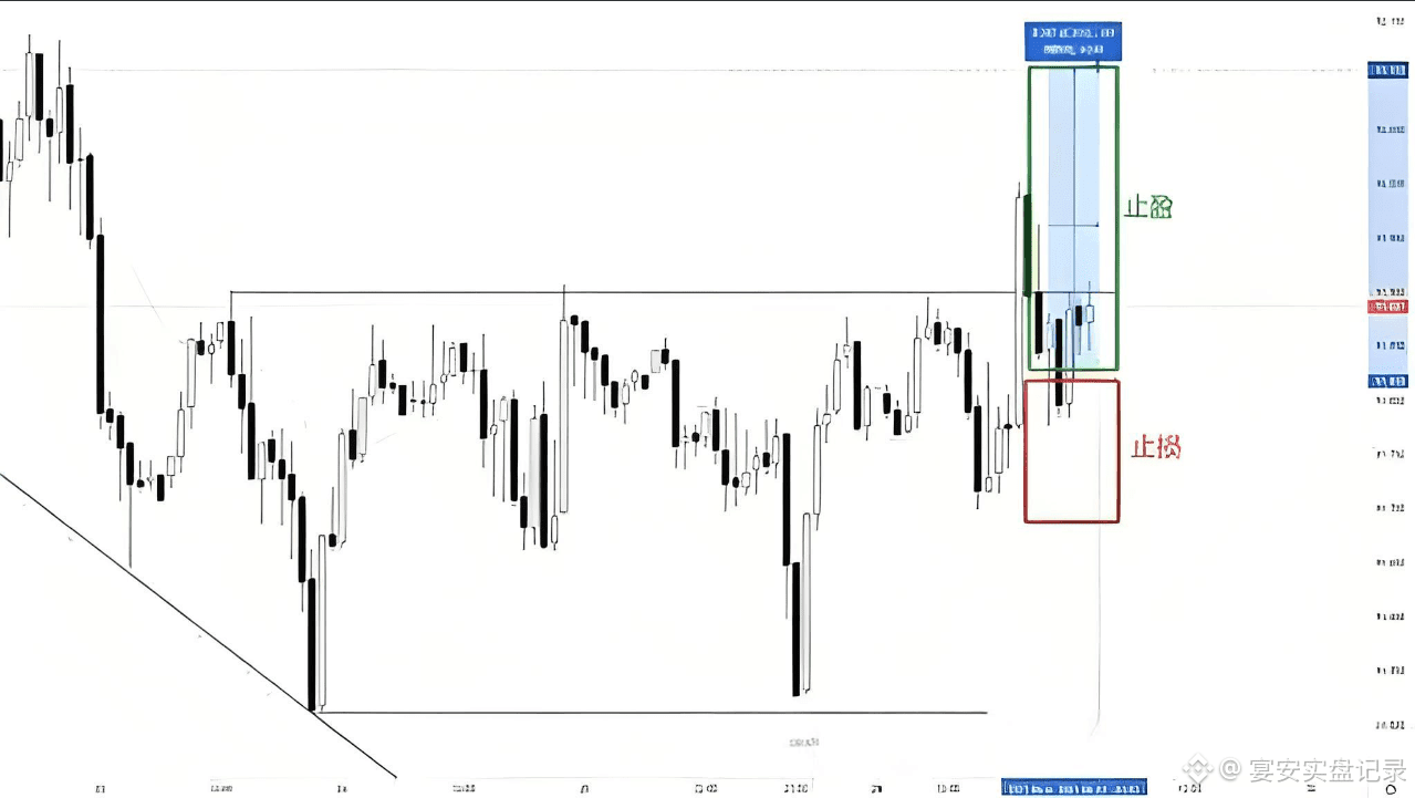 2.保守交易者:可以选择在楔形低点突破后的回调测试处挂单进场。这个位置比较安全,适合那些追求稳健的交易者。