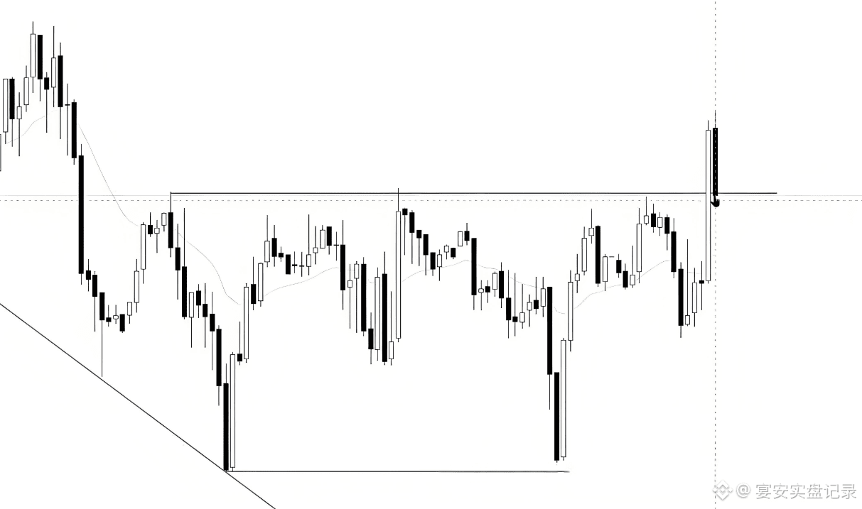 老规矩,拿到一张图,先看它的大周期发生了什么。我们可以看到,这明显是一次多头的突破,它突破了一个长期形成的底部交易区间。