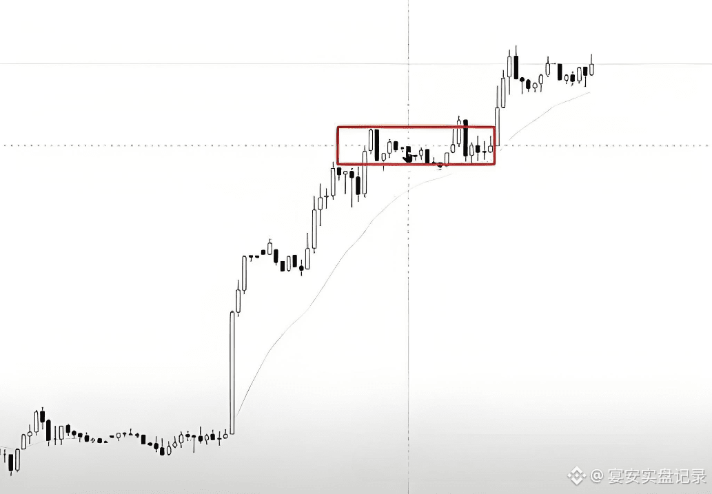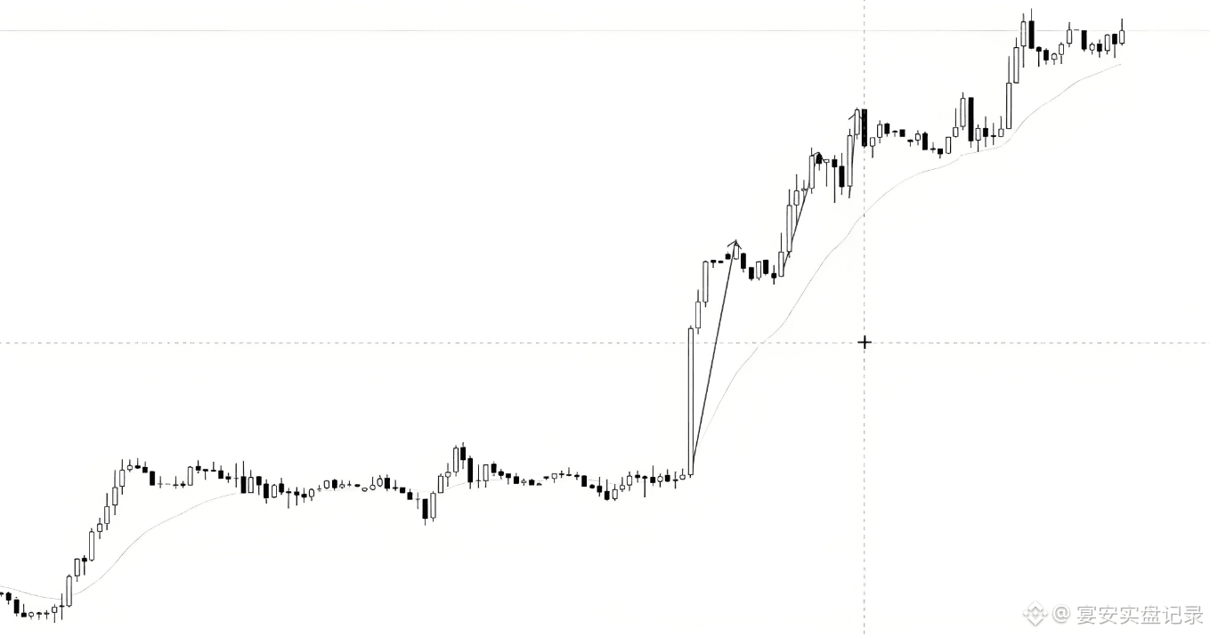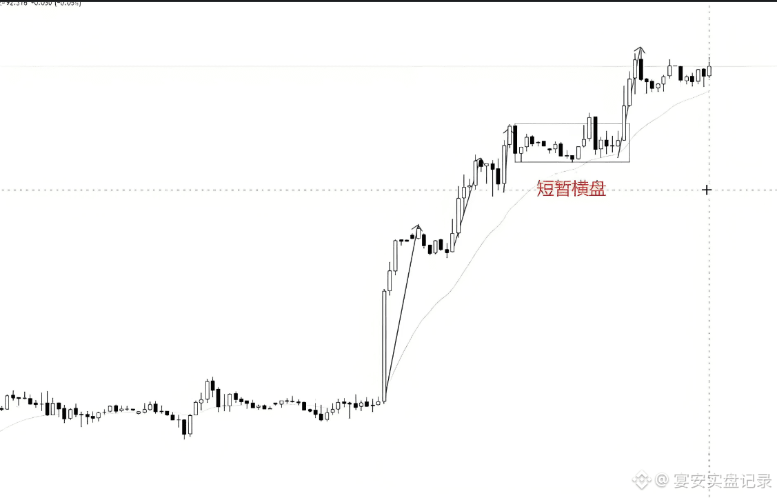 这段极速行情,是一次多头突破。突破之后带了两段小的上涨,这三段上涨能量依次减弱。你可以把它理解为三推的楔形,也可以把它理解为极速与通道(极速上涨,转成上升通道形态)。