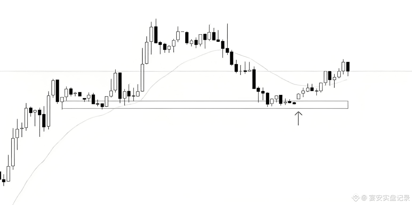 因此,第一次在这个位置参与做多时,我们不会设定很远的目标,而是等待二次测试时出现入场信号,再考虑拿到波段高点或更远的位置。