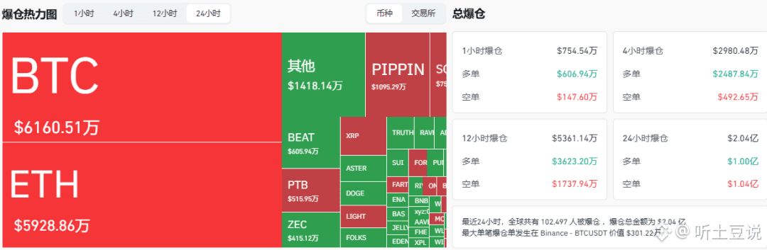 24小时全网共有102,497人被被爆仓,总额2.04亿美元,其中多头惨遭血洗($1.00亿),空头也难幸免($1.04亿)。