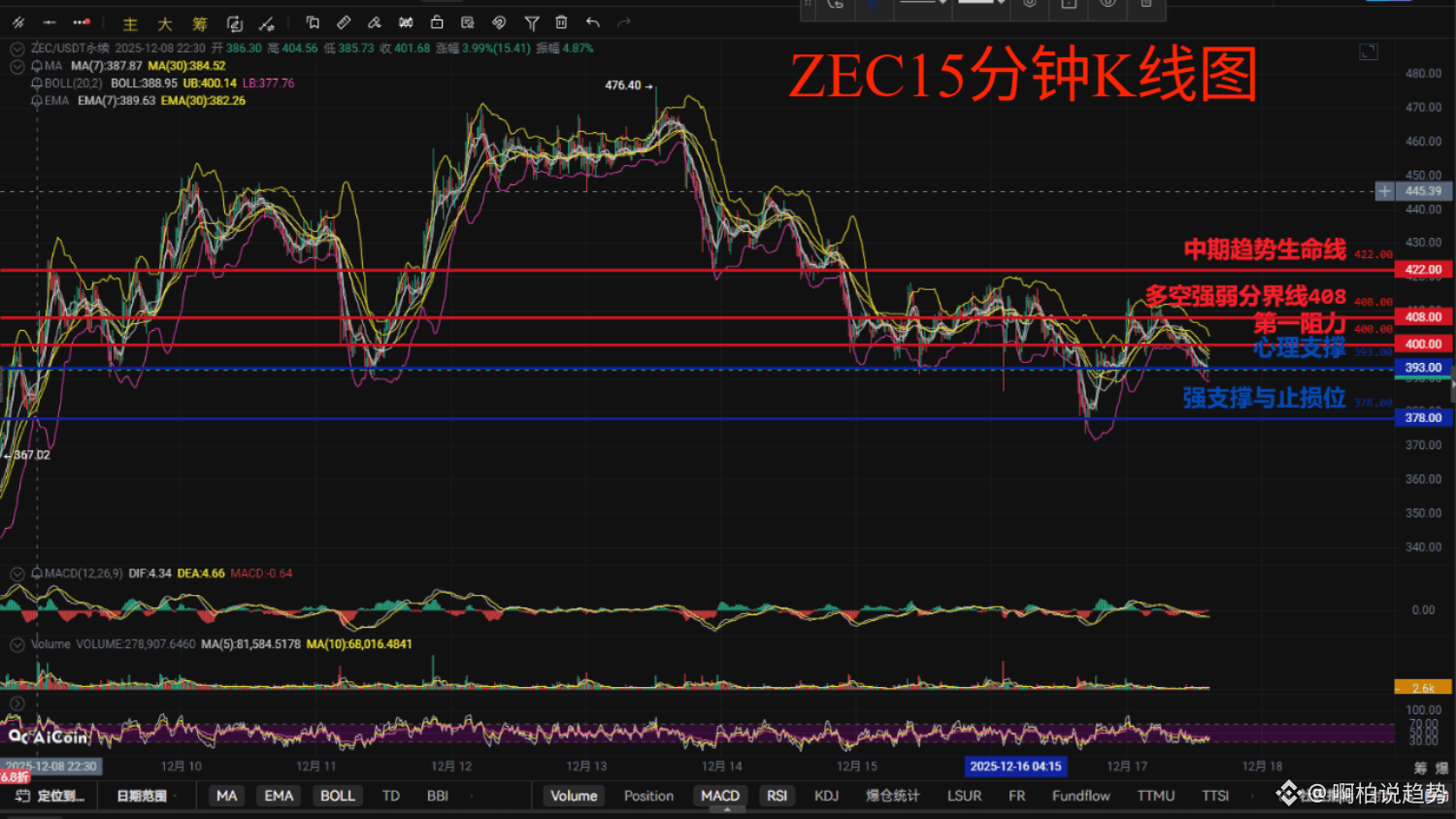 再来说说近期$ZEC 的走势:ZEC目前处于空头趋势里的弱势震荡修复阶段,整体市场结构偏空。价格在关键均线下方运行,虽然短期下跌动能有所减弱,在390附近尝试构筑临时震荡平台,但后续走势仍充满不确定性。
