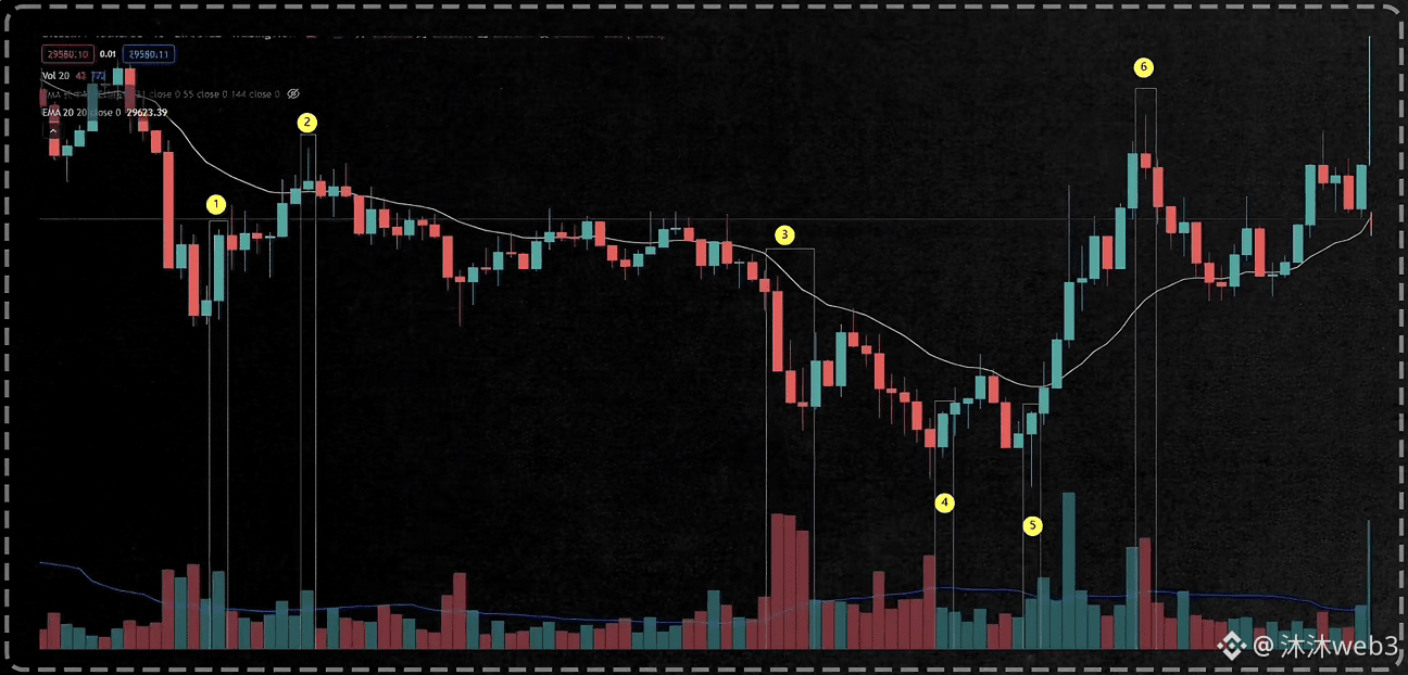 编号5:成交量变化不大,但价格振幅增大,量价异常,结合此处为支撑位以及编号4的分析,此处适合做多,止盈放在编号2的位置,因为经分析此处埋伏了很多空头力量;