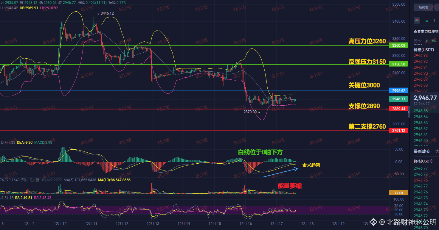 基于“消息利空+技术破位+资金出逃”三重共振,我判断ETH后市跌破2890的概率超过70%。所谓的“金叉”是技术性诱多,尤其在周五日本央行决议的潜在冲击下,任何反弹都是逃命机会。3000点不是起点,而是终点。想冲3150、3260?需要全球流动性突然逆转,这在加息背景下几乎不可能。