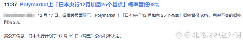 币友们,我是赵公明。刚看到一个几乎确定的“炸弹”:Polymarket预测日本央行周五加息概率高达98%。全球流动性收紧的刀子,已经悬在所有风险资产头上——包括你手里的$ETH 。市场可能要变天了。关注赵公明,带你了解加息背后的影响!