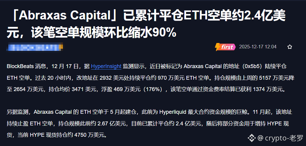 Abraxas Capital的撤退是一个重要信号,表明专业空头认为当前价格已经接近短期底部。但他们平仓后的资金流向值得关注,据监测部分资金已被用于增持HYPE现货。