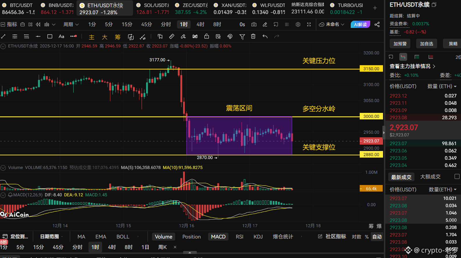 今天的关键是观察价格对3000美元心理关口的测试。ETH需要重新站上3000美元,并展现出持续的买盘力量,才能确认短期底部的形成。