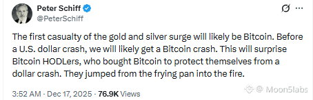 Schiff warns that many investors could be caught off guard if Bitcoin crashes — especially those who bought it as a hedge against a potential collapse of the U.S. dollar. He believes capital is now flowing back into “safe haven” assets like precious metals, and that Bitcoin is losing its shine in this environment.