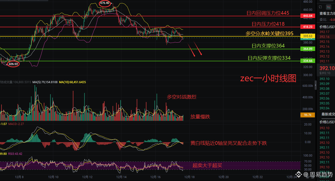 目前 ZEC 一小时图明显弱势,MACD 死叉配合下跌放量,说明空头还在发力。关键位置要盯死:上方 418 是日内压力,445 是回调压力,这两个位置如果冲不上去,就是空单机会。下方先看 395–364 这个区间,如果撑住,短线可以抢反弹;如果跌破,大概率要去 334 找支撑!