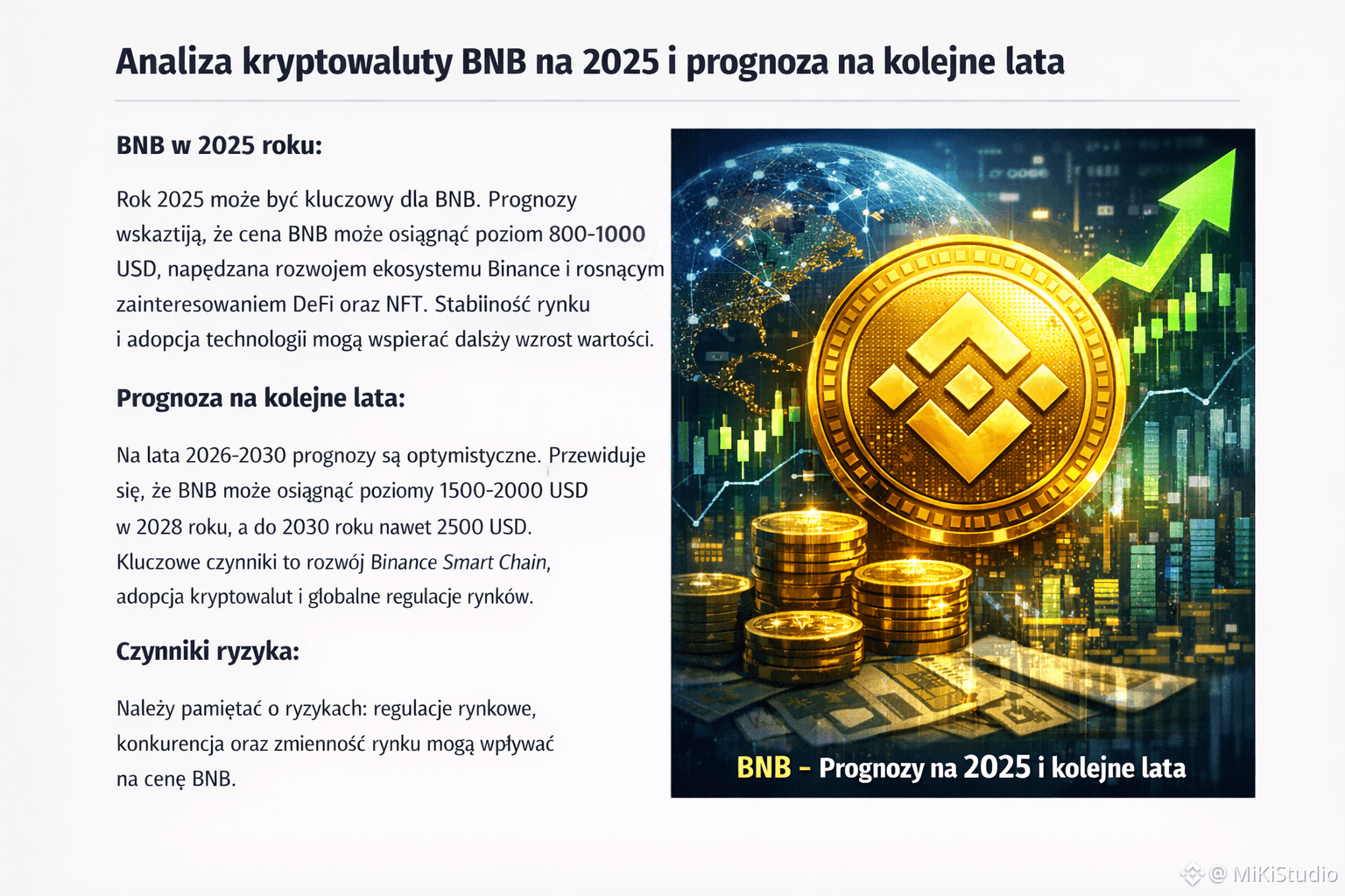 $BNB (Binance Coin) to natywna kryptowaluta ekosystemu Binance, jednego z największych podmiotów na rynku aktywów cyfrowych. Od momentu powstania BNB ewoluowało z prostego tokena użytkowego do kluczowego elementu rozbudowanego ekosystemu obejmującego giełdę Binance, BNB Chain (dawniej Binance Smart Chain), zdecentralizowane finanse (DeFi), NFT, gaming oraz rozwiązania Web3. Rok 2025 jest dla BNB okresem dojrzałości projektu i testem jego długoterminowej wartości.
