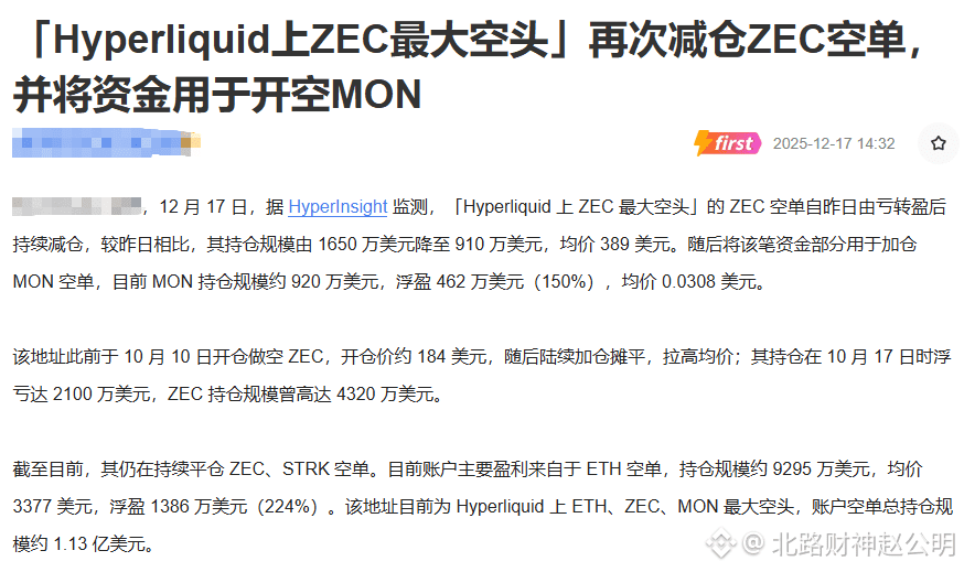 这个“最大空头”不是一般人,10月开空,一度浮亏2100万都没跑,扛到现在终于盈利。他现在减仓,说明他认为ZEC继续大跌的空间有限了。但他把资金又转去空其他币,说明他整体还是看空市场,只是不看好ZEC继续单独暴跌。这对ZEC短期算个小利好,可能意味着抛压减轻,但别高兴太早——这不等于马上要暴涨。