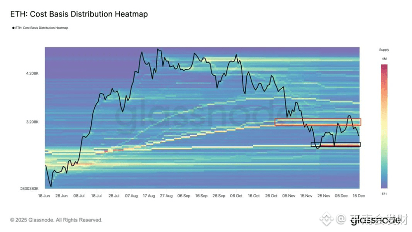 Glassnode成本基础分布热图显示,在3100至3250美元之间存在明显阻力,投资者在该价格区间已购买了约590万枚ETH。