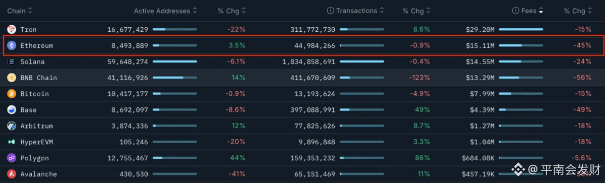 过去30天以太坊链上费用总计1510万美元,较上月减少45%。相比之下,BNB Chain的费用下降了56%,Tron经历了15%的下跌。