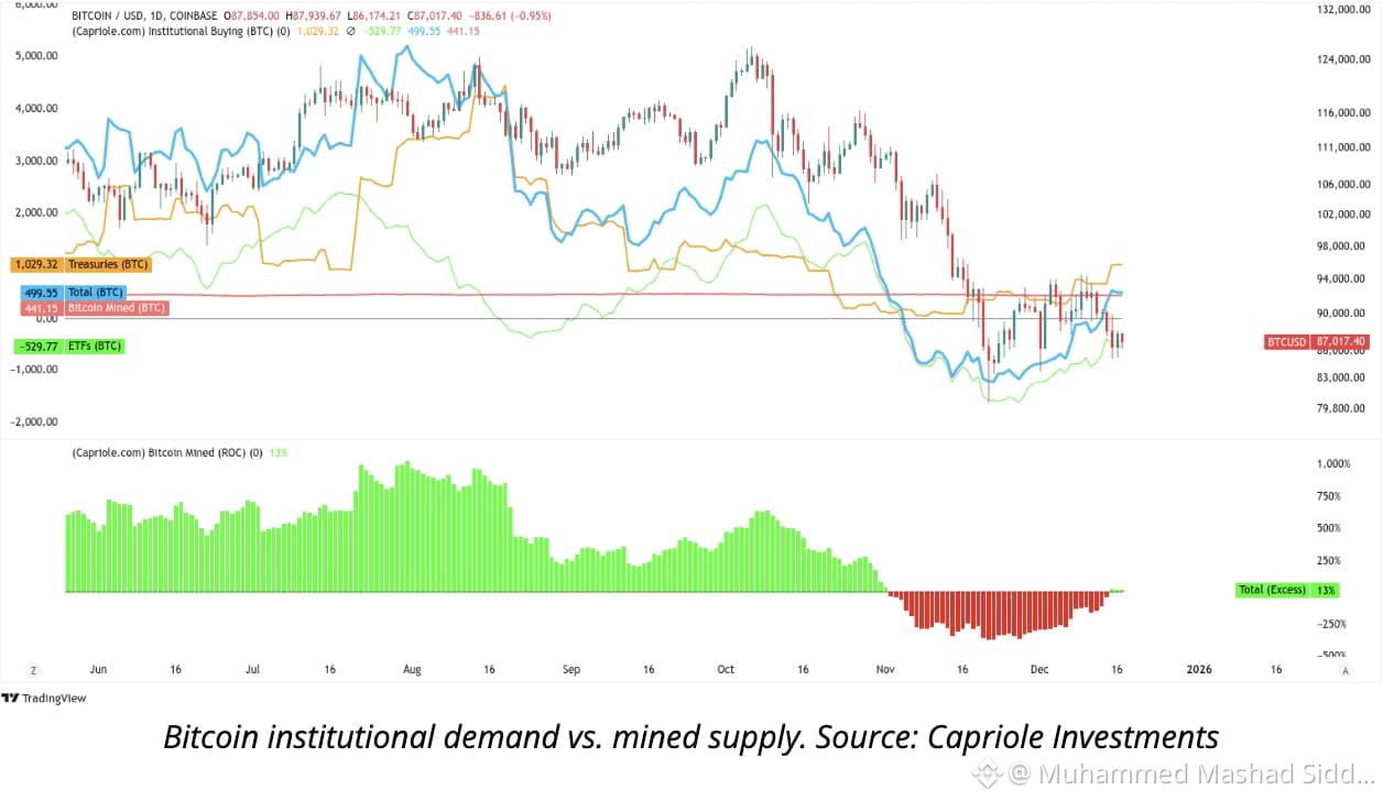 Institutional Bitcoin demand is now 13% higher than daily mined supply, marking the first net supply reduction since early November.