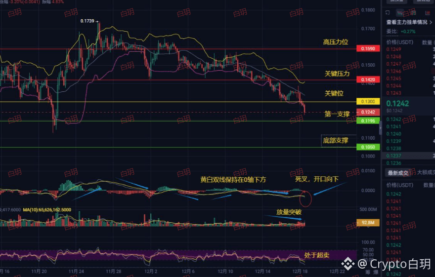 盘面上,那几条代表趋势的均线,全在零轴下面,还走出了“死叉”,意思就是短期跌势压过了长期,空头目前确实占着上风。上面一堆压力位,0.1300、0.1420、0.1590,层层叠叠,想上去得费不少劲。不过,注意看下面的MACD指标,已经怼到“超卖”区间了