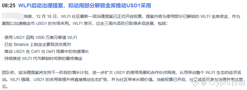 就在今天,WLFI社区没闲着,放出了一个新提案:准备动用一部分已经解锁的金库资金,来大力推广他们自家的稳定币USD1!这可不是光喊口号,过去几周人家真金白银干了事儿:用USD1回购了价值1000万美元的WLFI代币,还在币安锁定了主要交易对。这说明项目方在想方设法给生态注入活水,扩大USD1的使用场景。如果提案通过,更多资金和合作进来,对WLFI整个生态的经济活动肯定是个刺激。