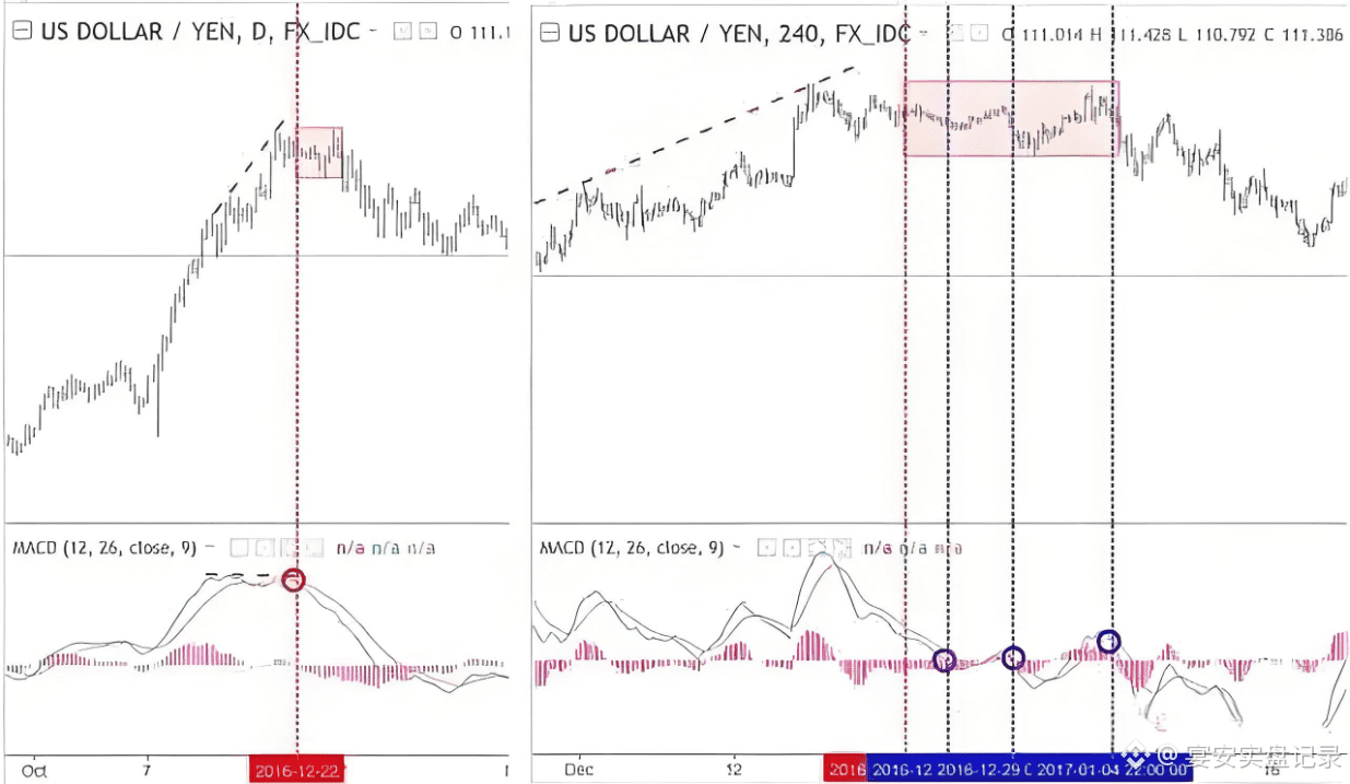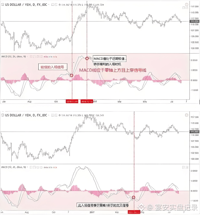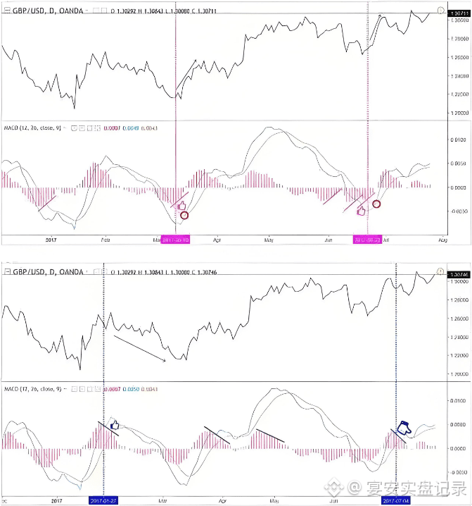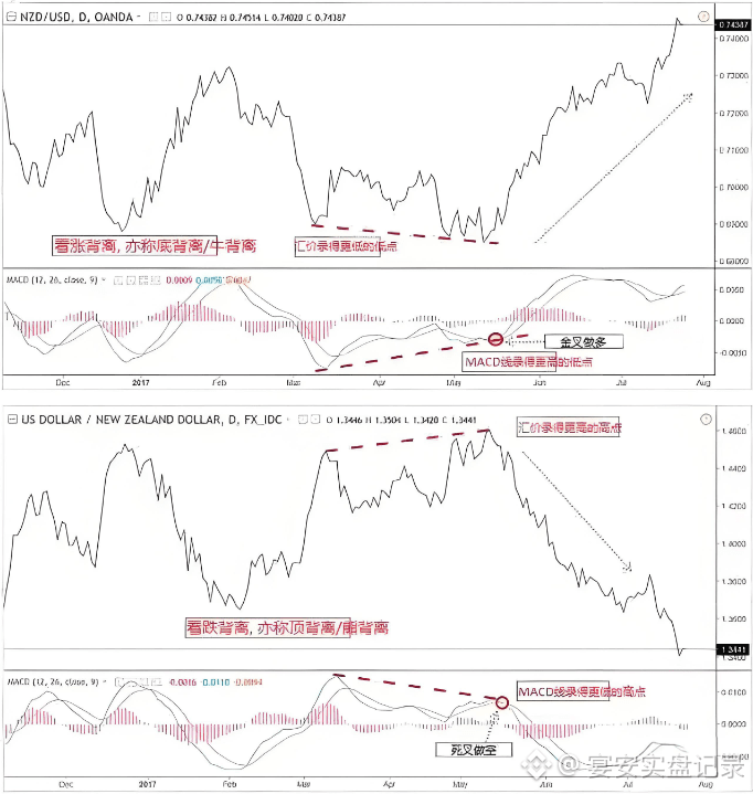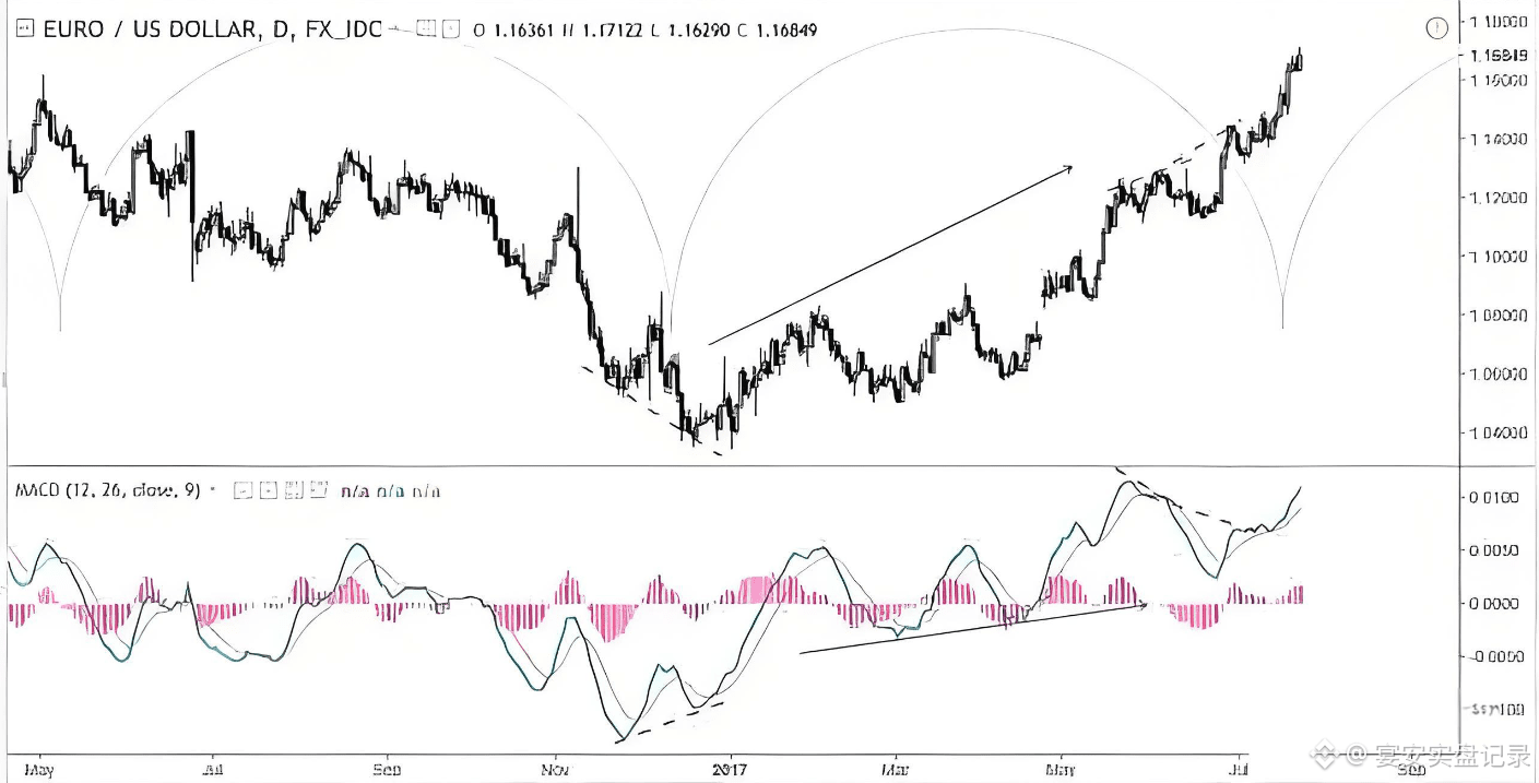 若价格创新低,但指标未能创新低,则MACD出现底背离,交易者在出现金叉时可以尝试入场做多。同样,若价格创新高,但指标却未能创新高,则MACD出现顶背离,交易者在出现死叉时可以试着入场做空。