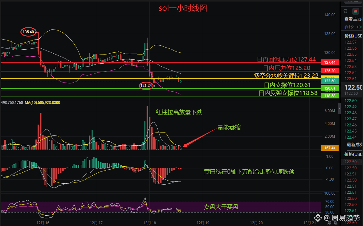 SOL大概率会先反弹一波再继续跌!反弹到125.2–127.44区间是绝佳做空机会,短期支撑看123.22–120.61,可小仓位吃反弹。