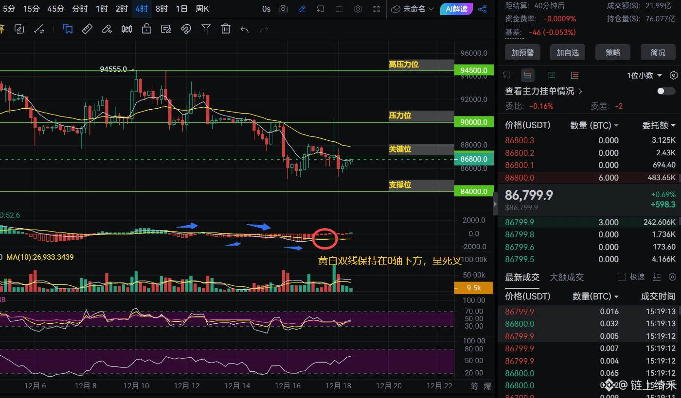 一小时图,一根根阴线往下砸,价格卡在86799这个位置,上不去下不来,憋得难受。MACD两条线在水下死叉,明明白白告诉你:下跌的劲头还没完!