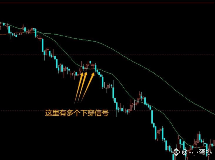 上图中,20和80均线空头排列,价格经历一波下跌后反弹,在箭头处多次下穿、上穿20均线。