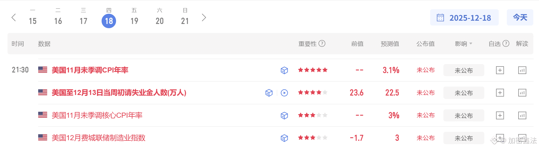 今晚21:30的CPI数据,是决定年末行情是启动反弹,还是延续低迷的关键节点。它将直接影响市场对美联储政策的最终定价,波动将不可避免。