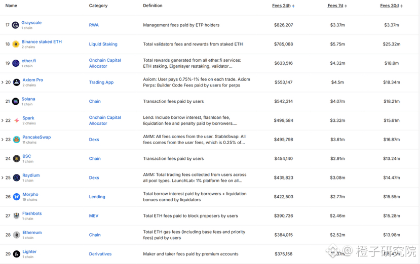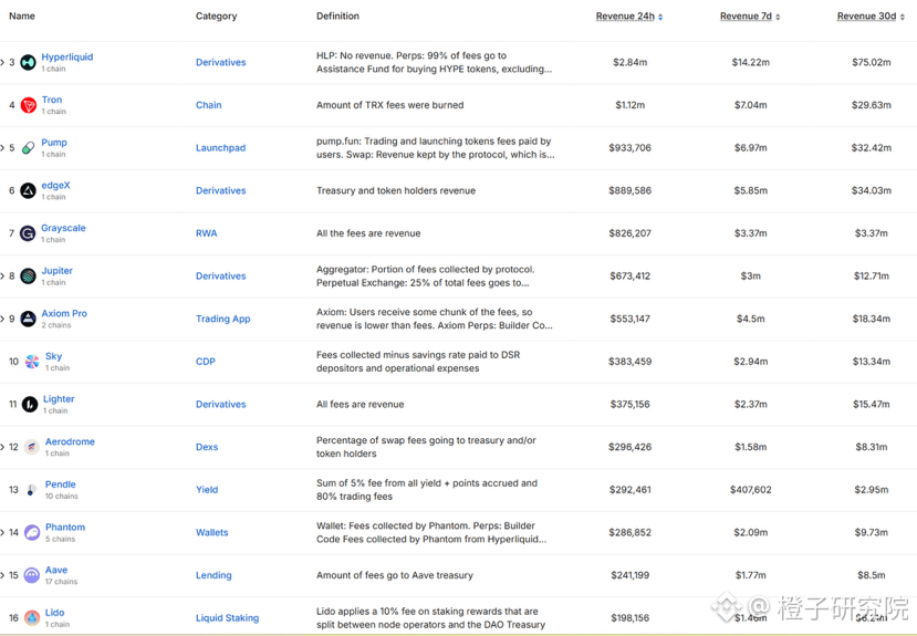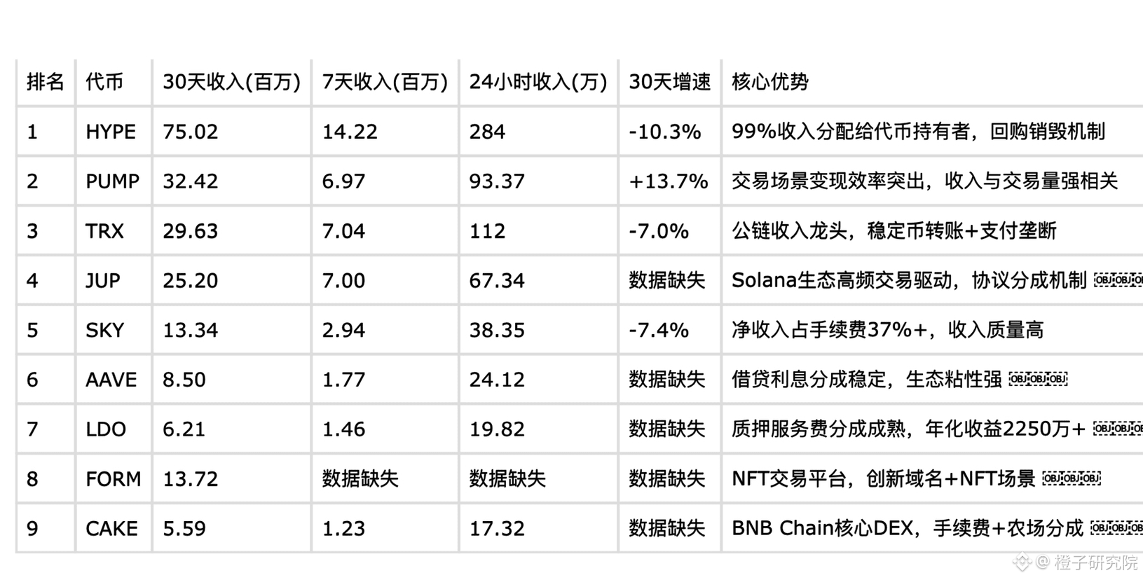 1. HYPE(Hyperliquid):24小时收入284万美元,7天收入1422万美元,30天收入7502万美元;99%收入分配给代币持有者,是当前链上收入能力最强的协议之一。