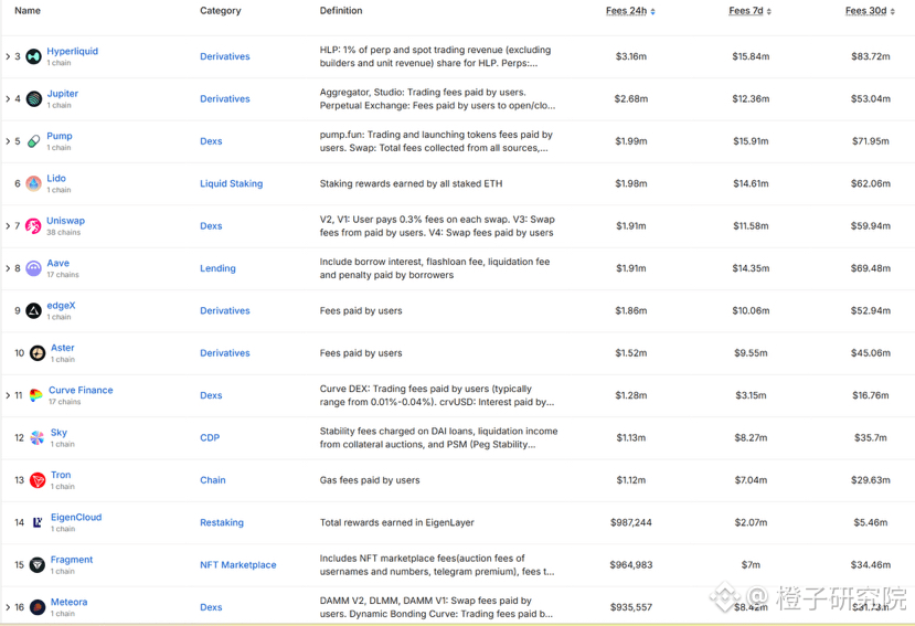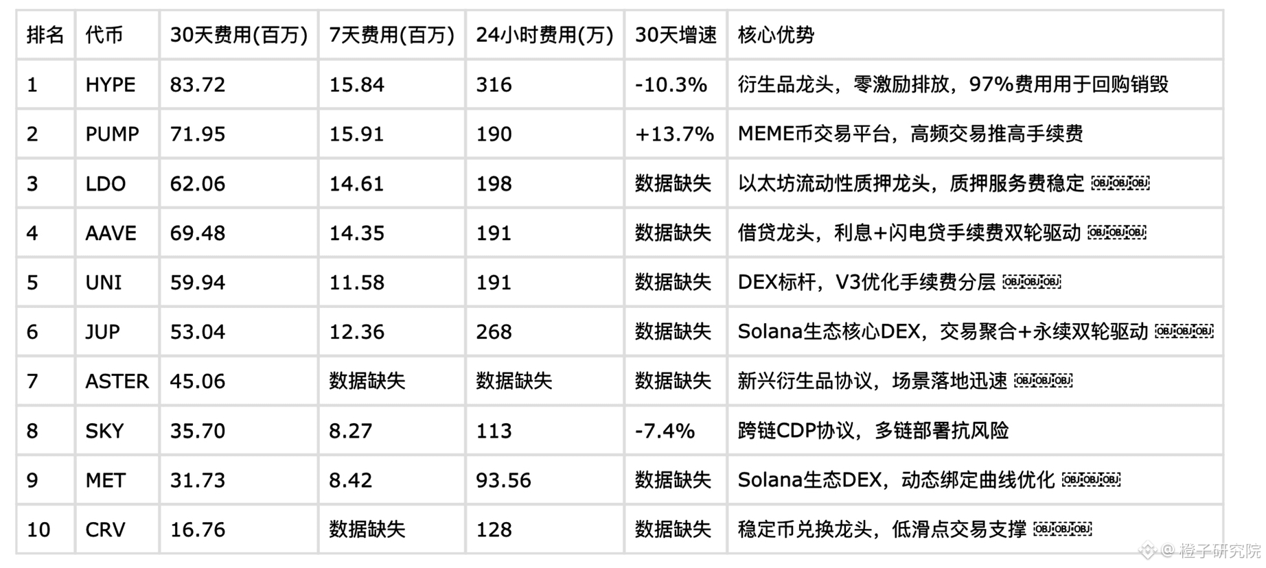 10. CRV(Curve):稳定币兑换赛道龙头,24小时费用128万美元,30天费用1676万美元;低滑点交易场景支撑基础手续费,虽受债务问题影响,但费用规模仍居细分赛道前列。