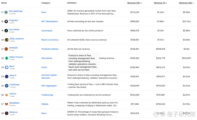 9. CAKE(PancakeSwap):BNB Chain生态核心DEX,24小时收入17.32万美元,7天收入123万美元,30天收入559万美元;交易手续费与农场挖矿分成构成收入核心,稳居BNB Chain生态收入榜首。