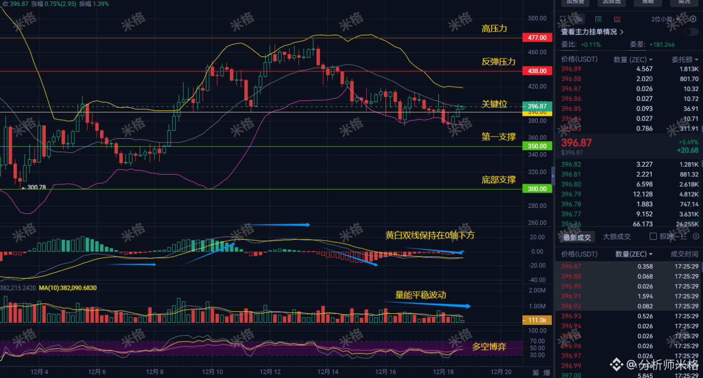 我的个人观点: ZEC当前处于上涨趋势没错,但是整体量能波段不大,处于缓慢上涨。而且目前MACD双线在0轴下方,4小时级别线还是空头在主导,加上今晚数据失真的情况,会有拉升,但是整体的拉升力不会很强势。我个人预测偏向于上涨到420附近再下跌到关键位390-370之间。