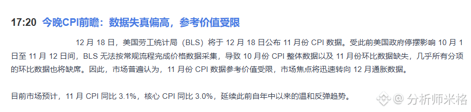数据本质“失真”:因为之前美国政府停摆,统计机构在10月到11月中期间压根没正常采集数据。出来的11月CPI,特别是关键的环比数据,可信度大打折扣。