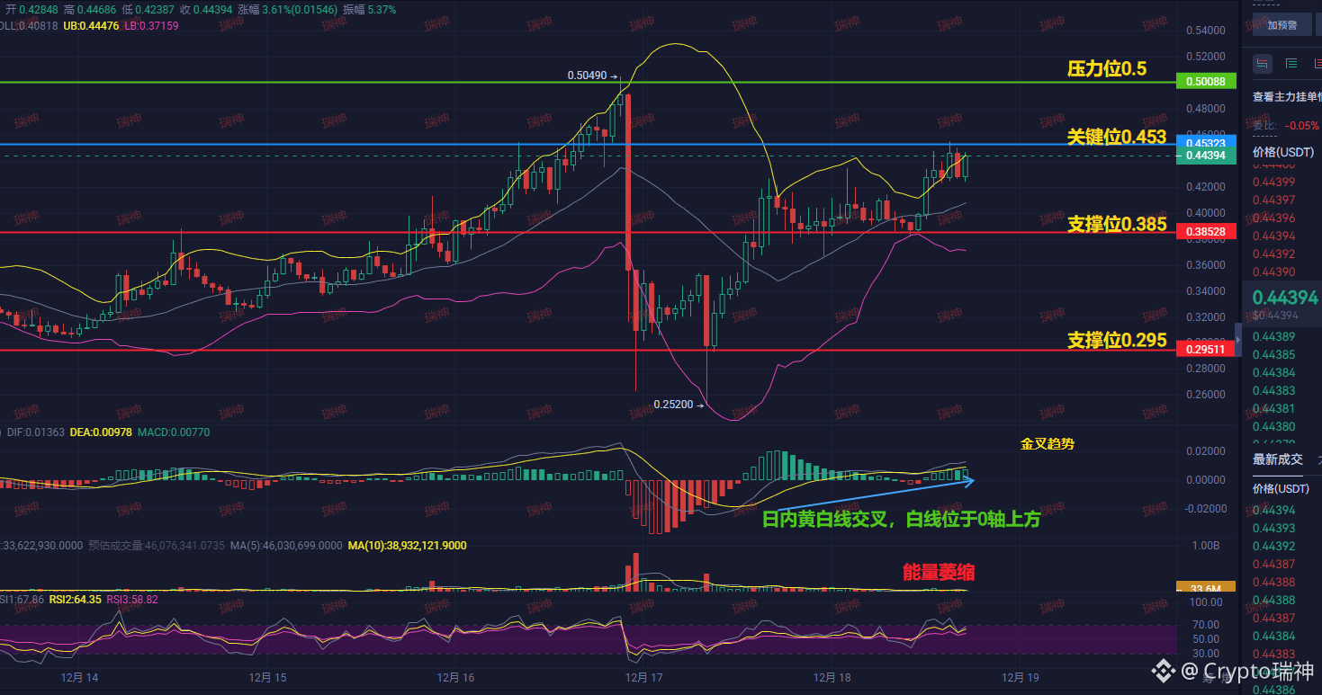 价格刚刚放量突破,正兵临0.453关键位城下。一旦站稳,下一个目标就是0.5的强压力位。