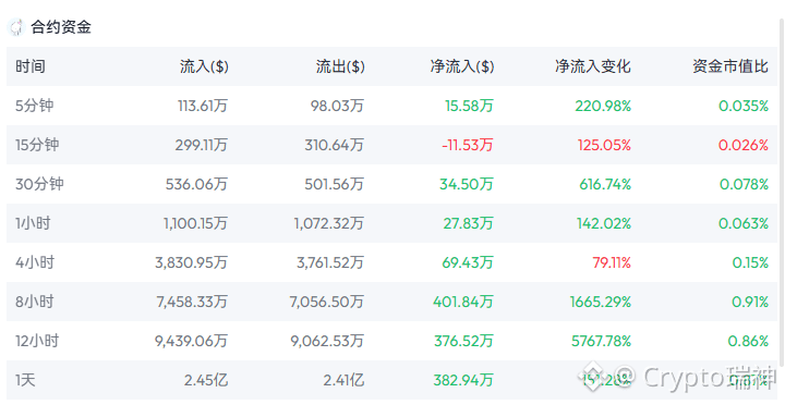 PIPPIN这次没刷屏的大新闻,但资金数据却异常诚实!看合约资金表:从5分钟到1天,所有周期全线净流入!尤其是8小时和12小时,净流入变化爆表,分别高达1665%和5767%!这说明什么?这不是散户的零散买入,是有规模的主力或游资在持续、大额地扫货建仓。他们用真金白银投票,比任何小道消息都靠谱。