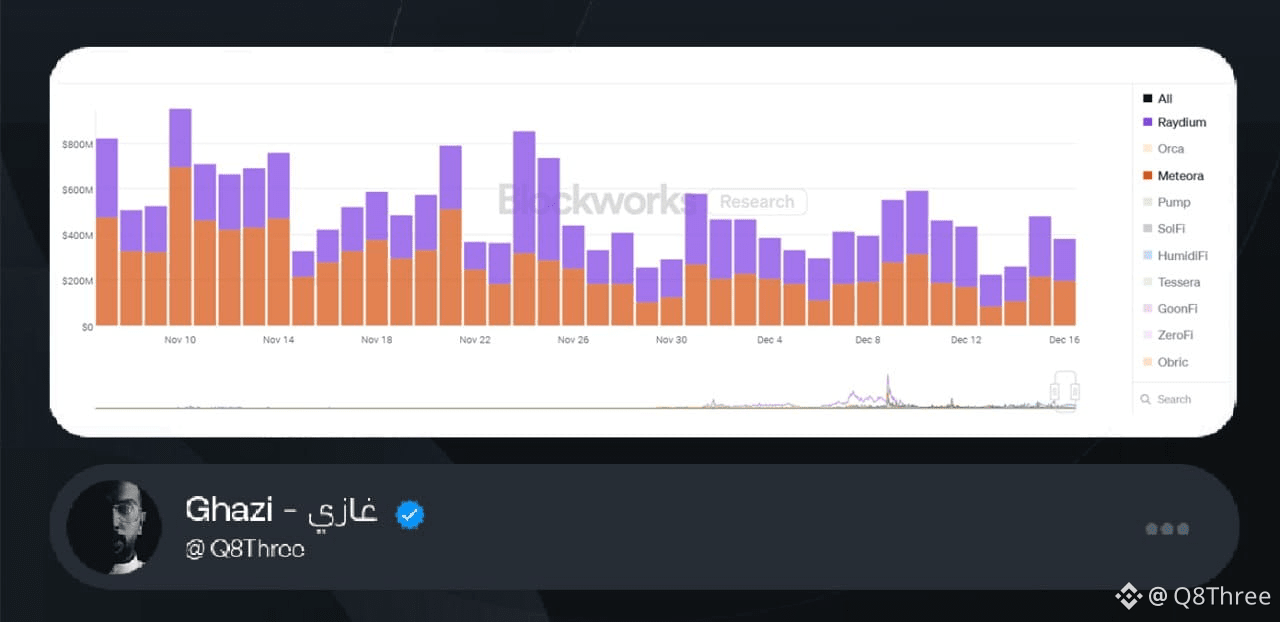 وبالتالي، تراجعت حصة Raydium بشكل واضح، لصالح كل من PumpFun و Meteora.